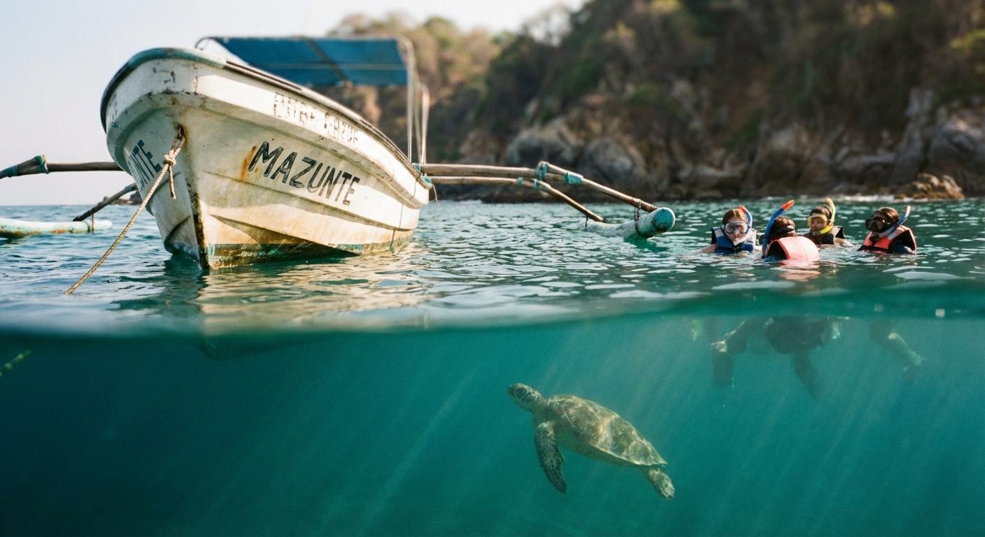 Vive la magia del Pacífico oaxaqueño con un recorrido en lancha donde el mar te muestra a sus gigantes y guardianes: ballenas (en temporada), delfines, tortugas, mantas y aves marinas.